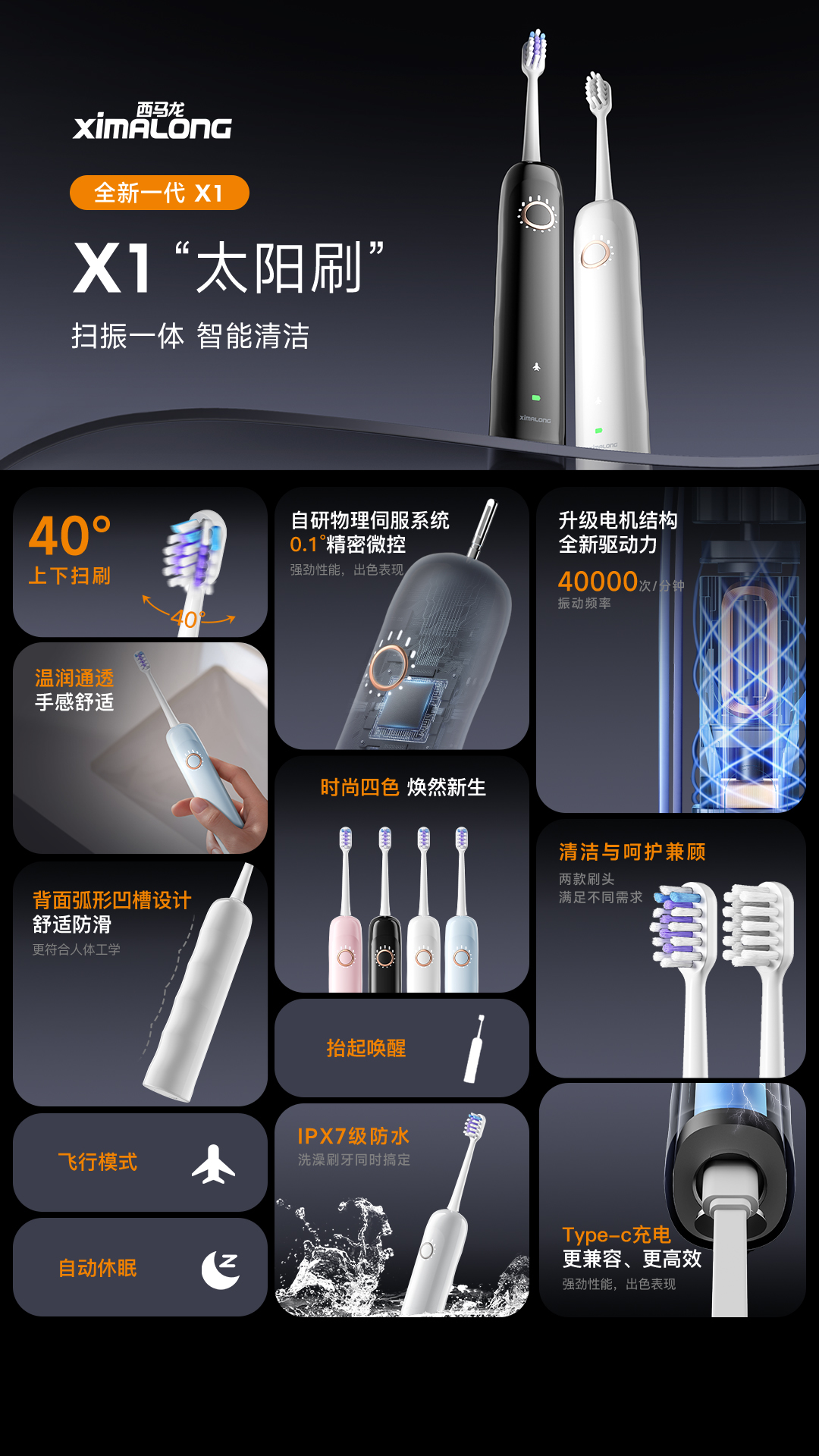 我们西马龙X1扫振电动牙刷的亮点不仅在于其独特的40°上下扫刷技术,更在于其超长续航、智能提醒等核心功能。续航方面采用高效的900毫安聚合物电池,一次充电即可使用长达60天,让用户无需频繁充电,更加省心省力。