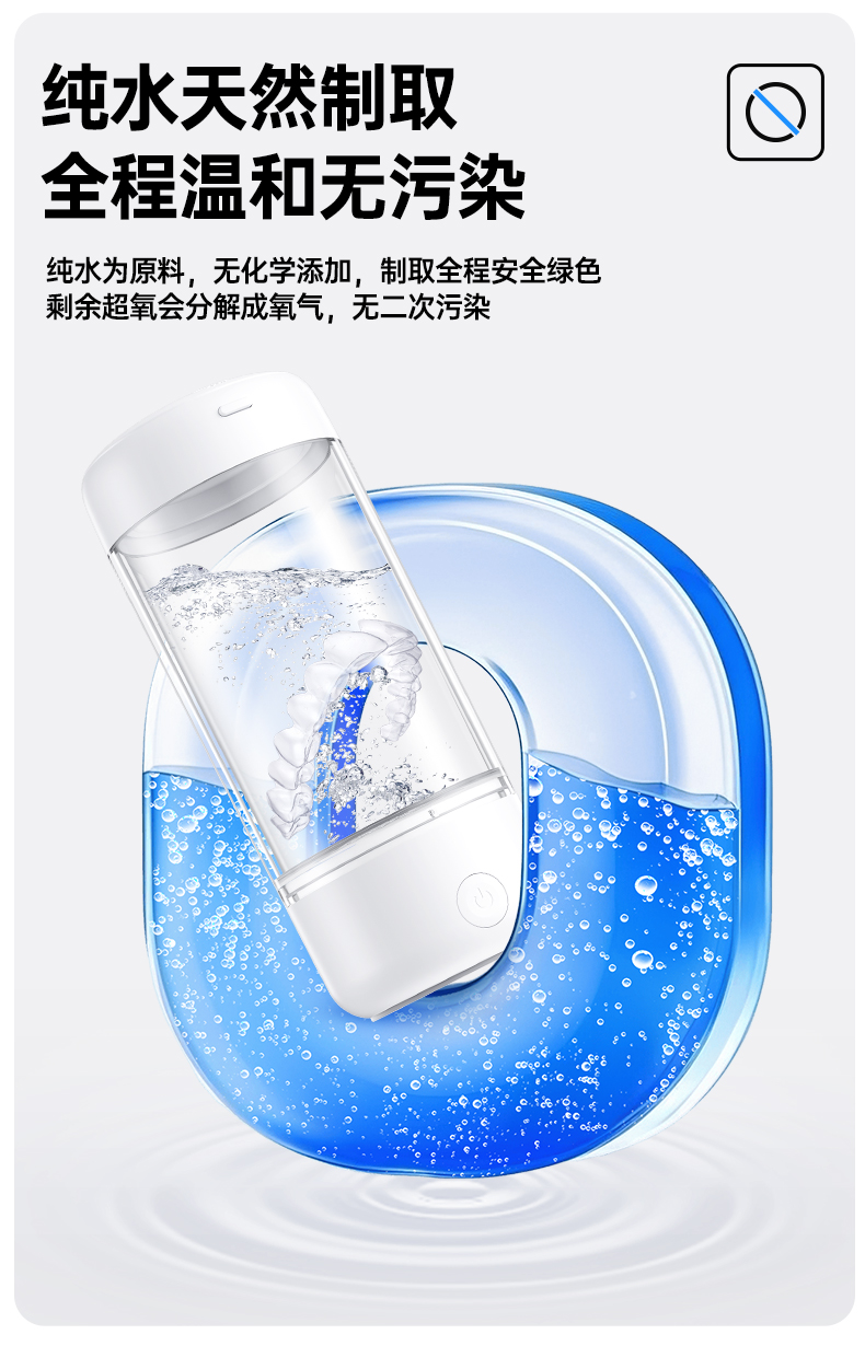 这款水杯的核心奥秘,在于其内置的尖端低压水解超氧发生器。它巧妙利用低压电解技术,将普通水分子(H₂O)分解为具有强大氧化还原电位的超氧(臭氧O₃)。这一过程清洁高效,无需额外添加化学药剂。