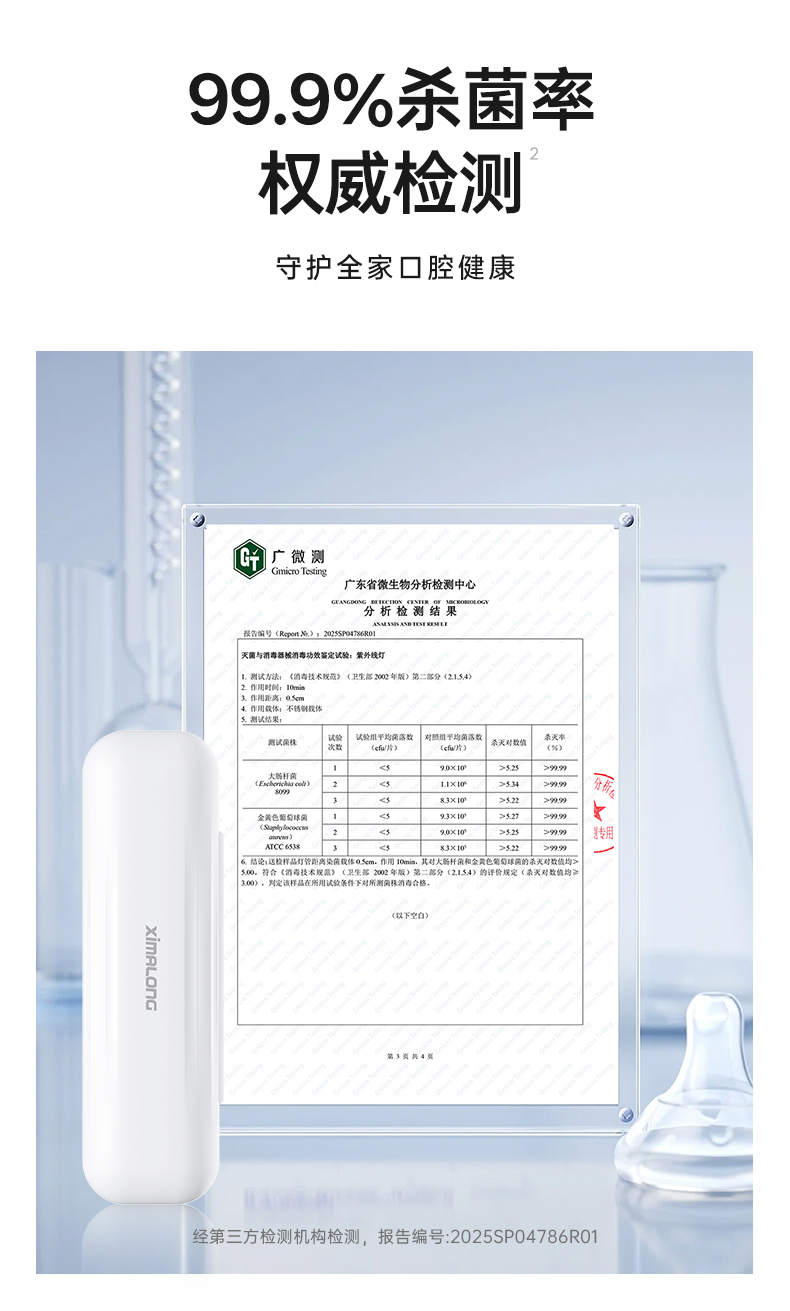 经权威实验室检测,对常见有害菌的杀灭率高达99.99%,真正实现“一照无忧”。
