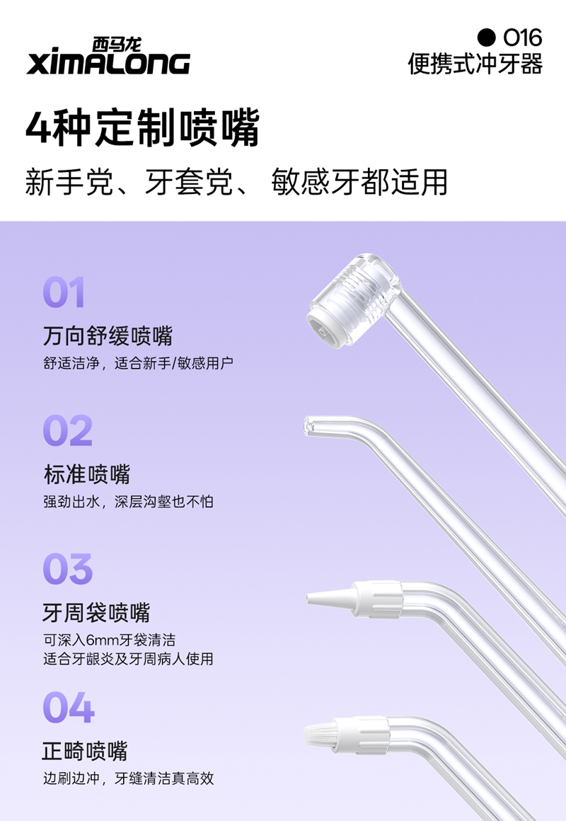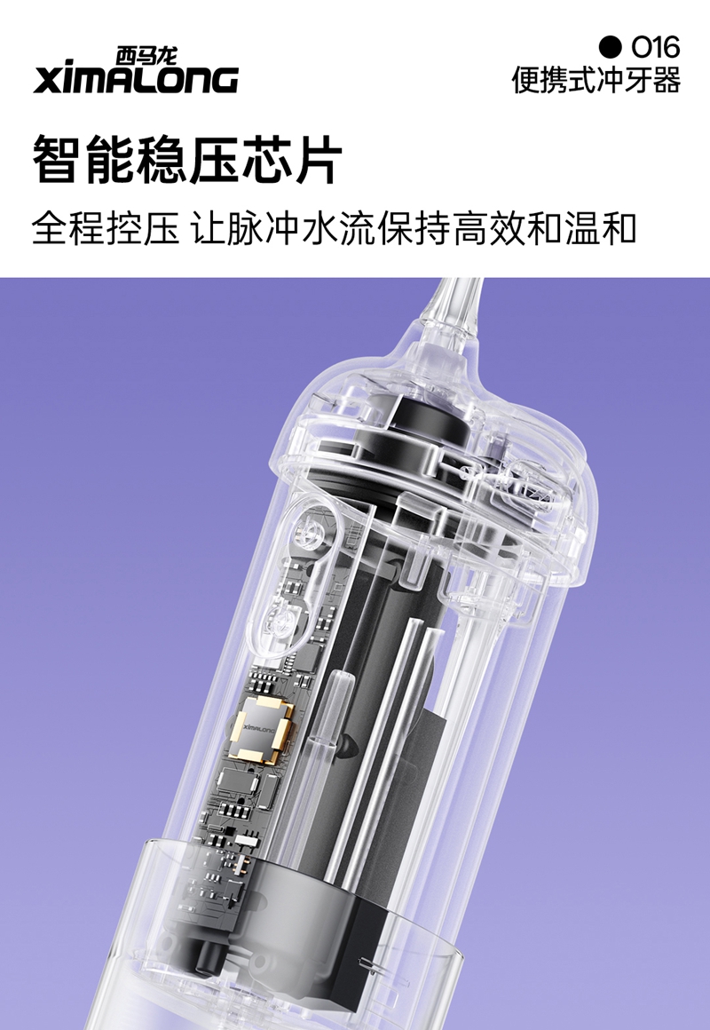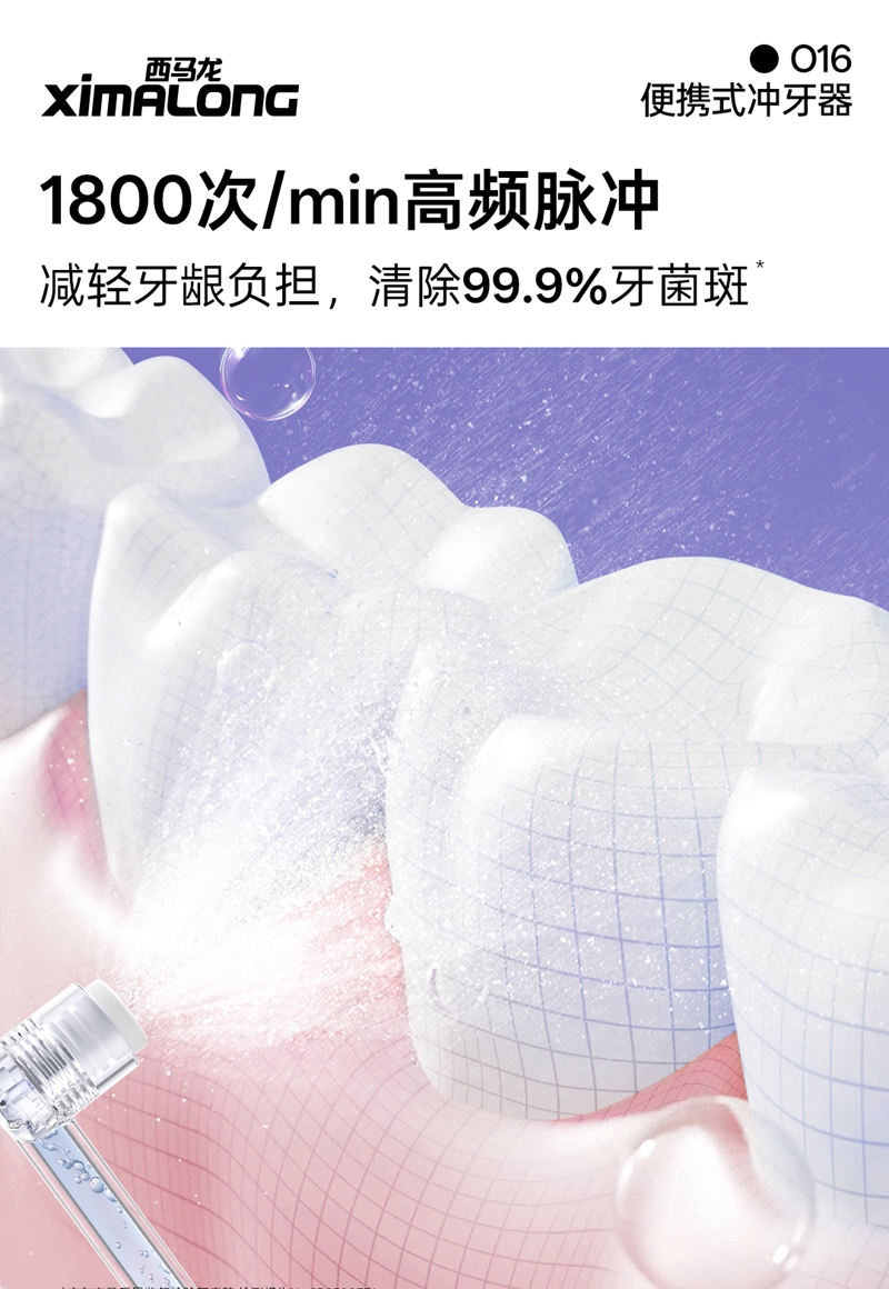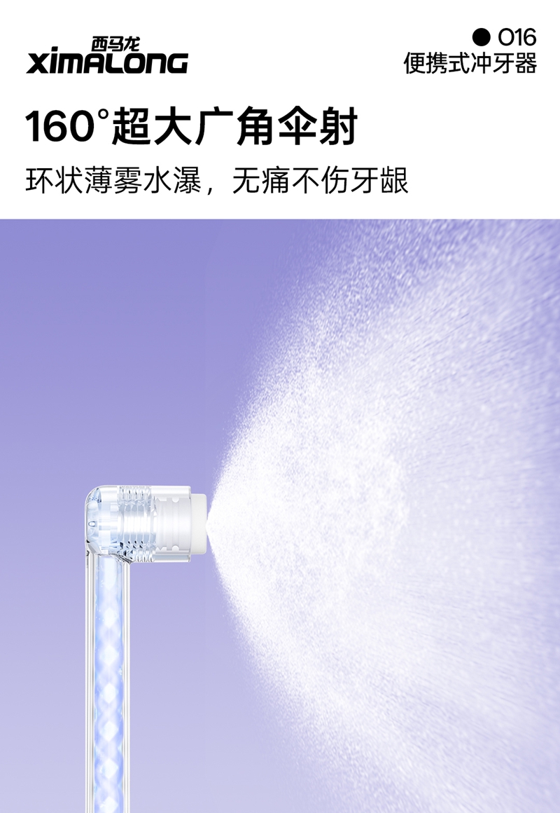 技术革新:万向舒缓喷头,洁齿不伤龈我们的冲牙器采用了独创的万向舒缓喷头,借鉴高端花洒的设计理念,将直射水流转化为伞射状水流,彻底解决了传统冲牙器冲击力过强的问题。