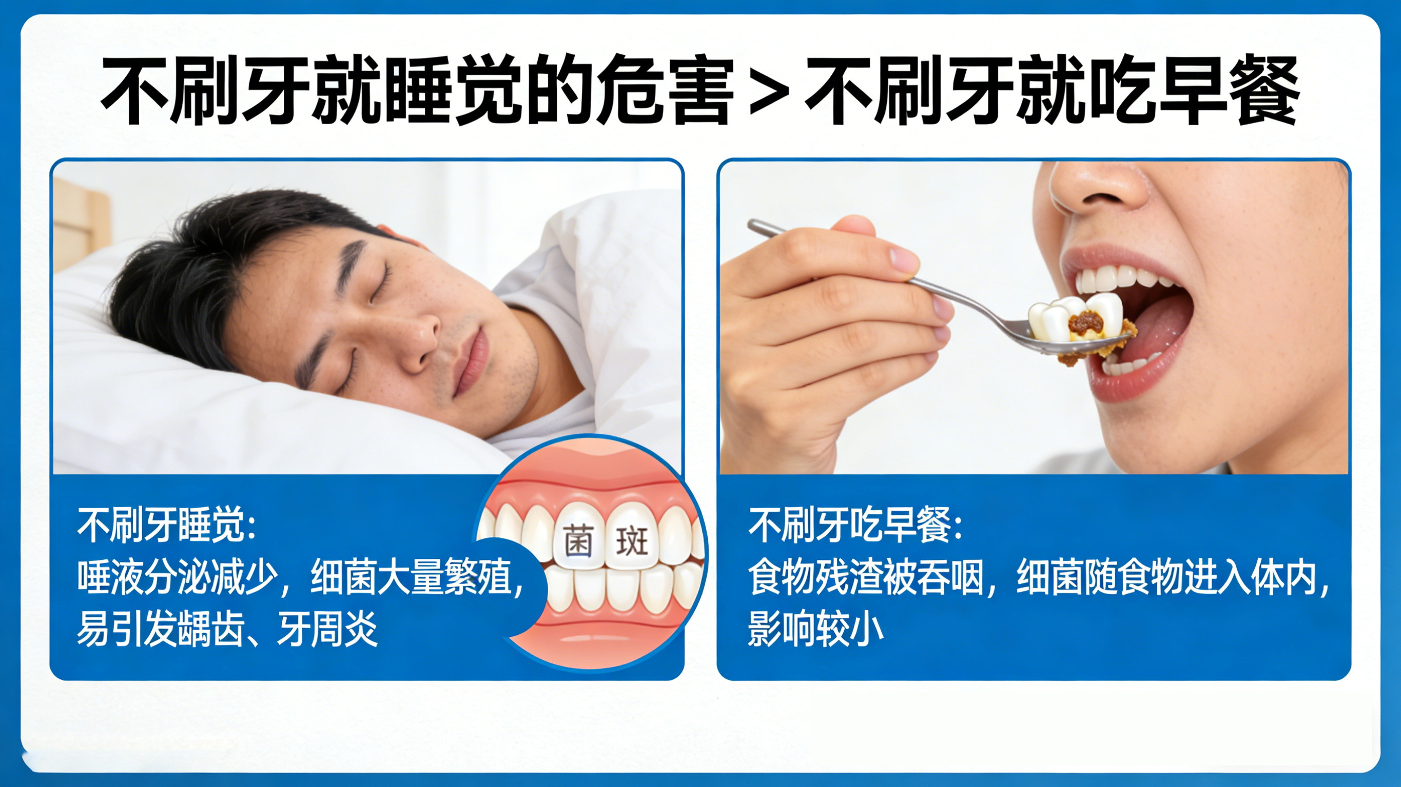 答案是:不刷牙就睡觉的危害,远远大于不刷牙就吃早餐。
