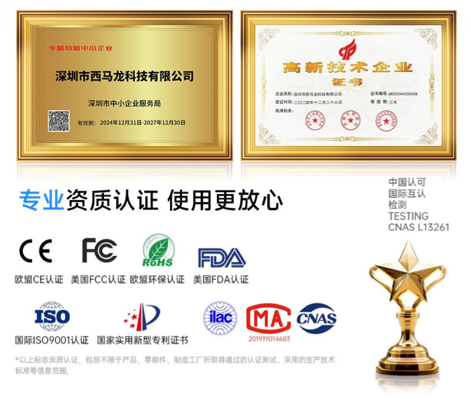 在为您深入介绍这套高品质礼盒之前,不妨先了解一下它背后的品牌故事。深圳市西马龙科技有限公司是一家集自主研发、生产、销售于一体的科技公司,深耕口腔健康领域已超过12年。公司拥有行业经验丰富的资深研发团队,始终坚持自主创新,已累计获得100余项专利及软件著作权,产品通过了FCC、CE、ROHS、FDA、ISO9001等多项国内外权威认证,并荣获美国MUSE创意奖、创新技术产品蓝点奖等多项荣誉。